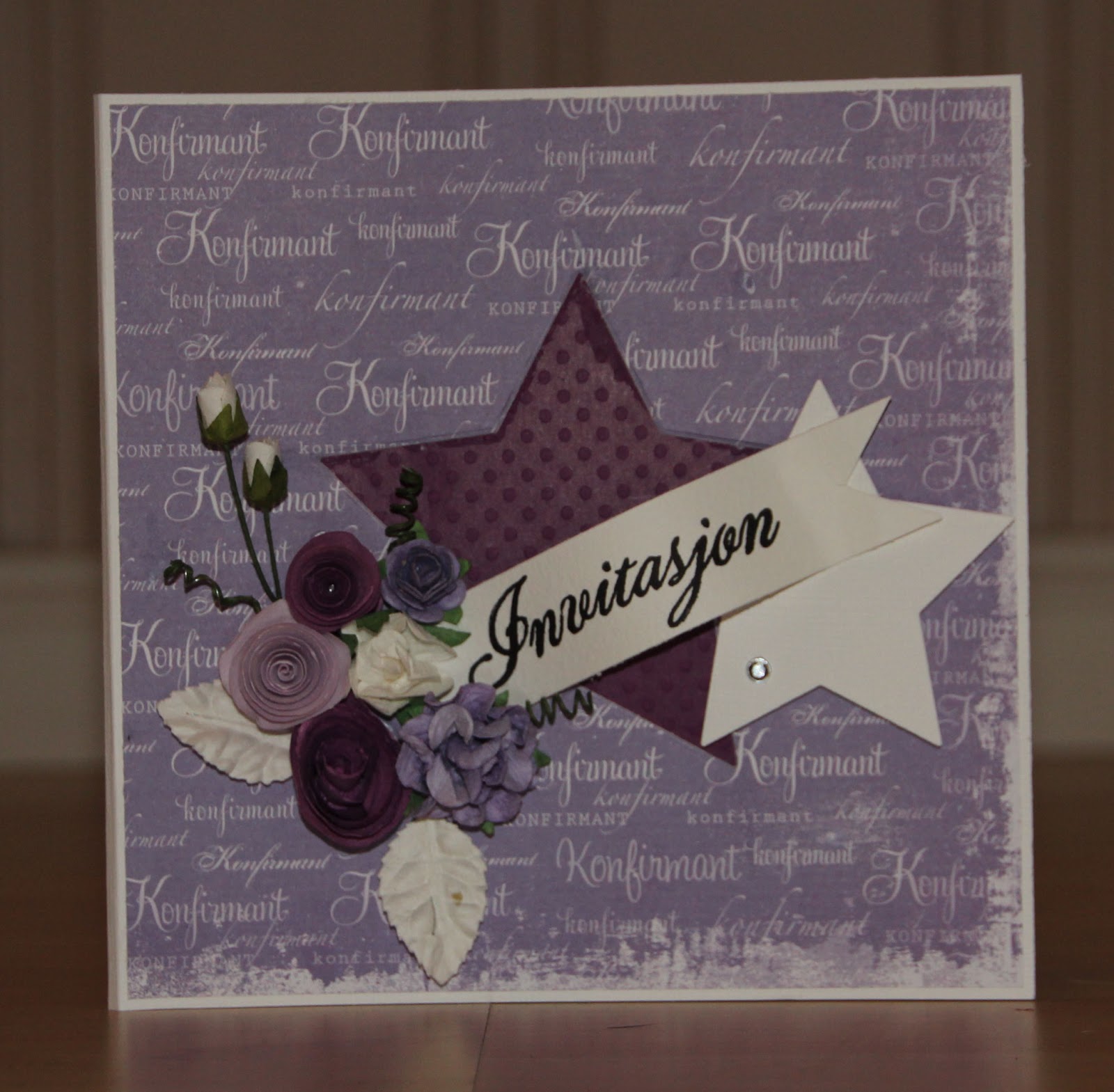 Her har jeg stanset ut en stjerne midt på arket, og limt på en farget stjerne på baksiden. Også dekorert med blomster, stjerne m/ 3d puter og bling.